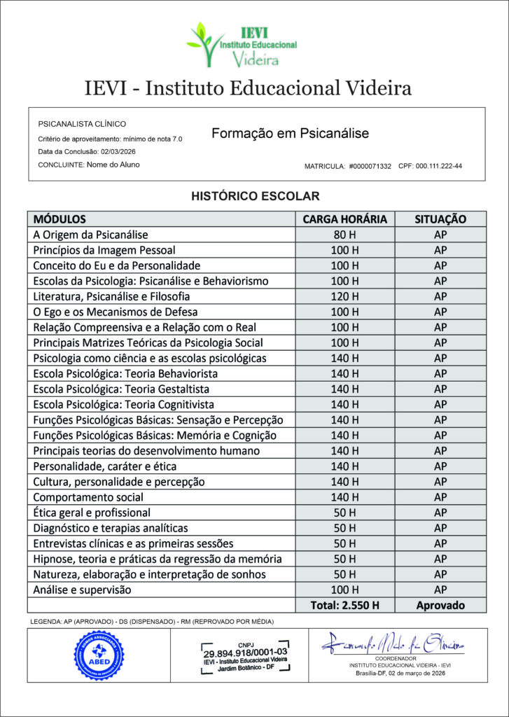 BASE LEGAL DO CERTIFICADO: Todos os certificados emitidos pelo IEVI – Instituto Educacional Videira, seguem a base legal da Lei nº 9394/96, do Decreto Presidencial n° 5.154, de 23 de julho de 2004, Art. 1° e 3° e as normas do Ministério da Educação (MEC) pela Resolução CNE n° 04/99, Art. 11, referente a educação continuada…
