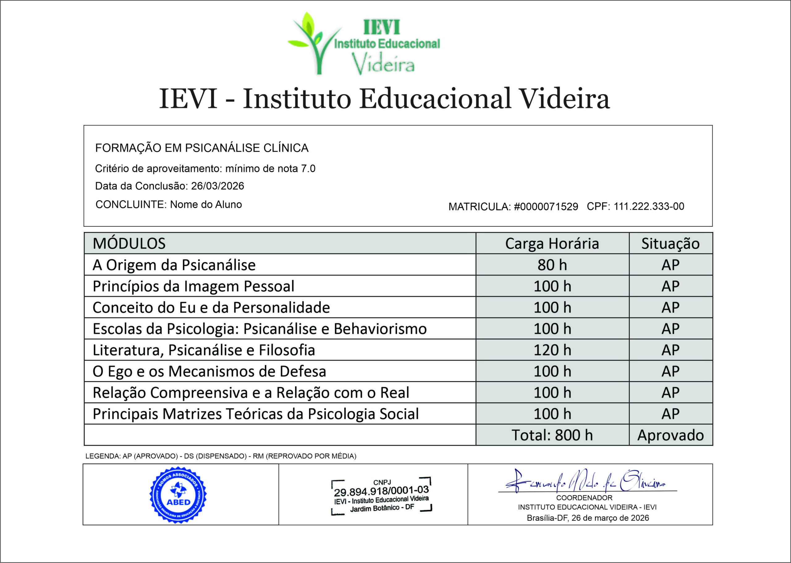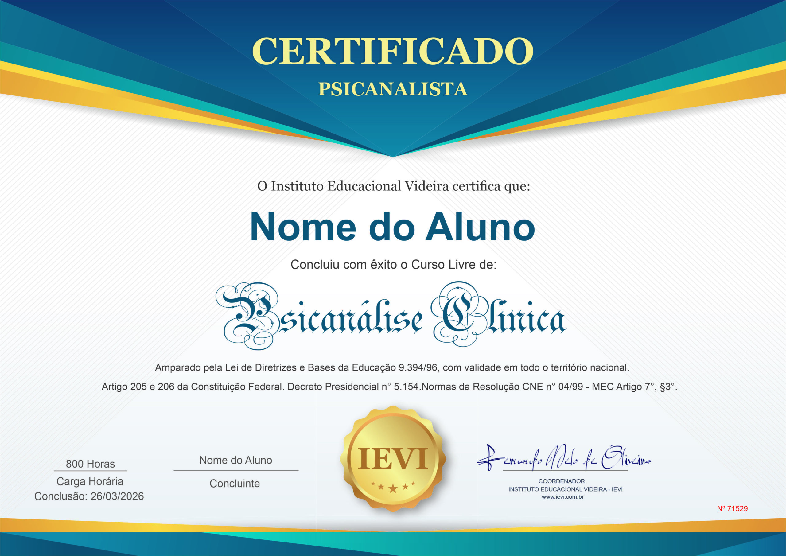 BASE LEGAL DO CERTIFICADO: Todos os certificados emitidos pelo IEVI – Instituto Educacional Videira, seguem a base legal da Lei nº 9394/96, do Decreto Presidencial n° 5.154, de 23 de julho de 2004, Art. 1° e 3° e as normas do Ministério da Educação (MEC) pela Resolução CNE n° 04/99, Art. 11, referente a educação continuada…